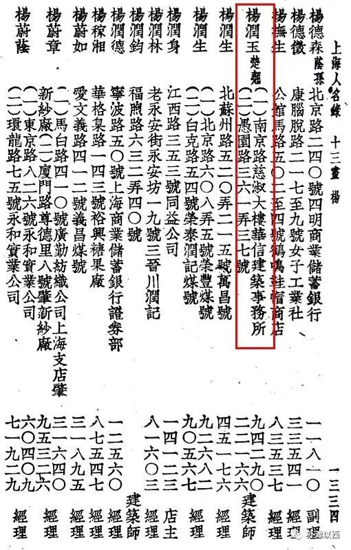 当我们看到楊潤鈞登记的自宅地址,眼前一亮,没想到,他是太古轮船公司大买办杨梅南的儿子。杨梅南、杨少南、杨铁梁一脉三代,杨润钧与杨少南是兄弟,杨梅南是徐润的表侄,徐敬直是徐润的孙子,看这一层层关系,又都是学建筑的,还同一院校毕业,合伙做生意,必然的。