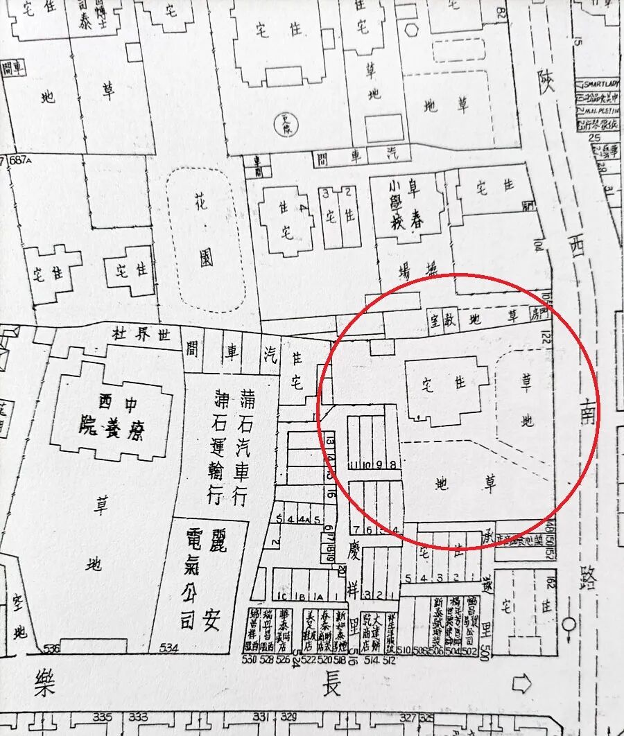 从城市酒店俯瞰陕西南路这一段,再和1947年行号路图录对比一下,陕西南路122号对面,原先的红房子西餐馆也没有了,起了小高层。