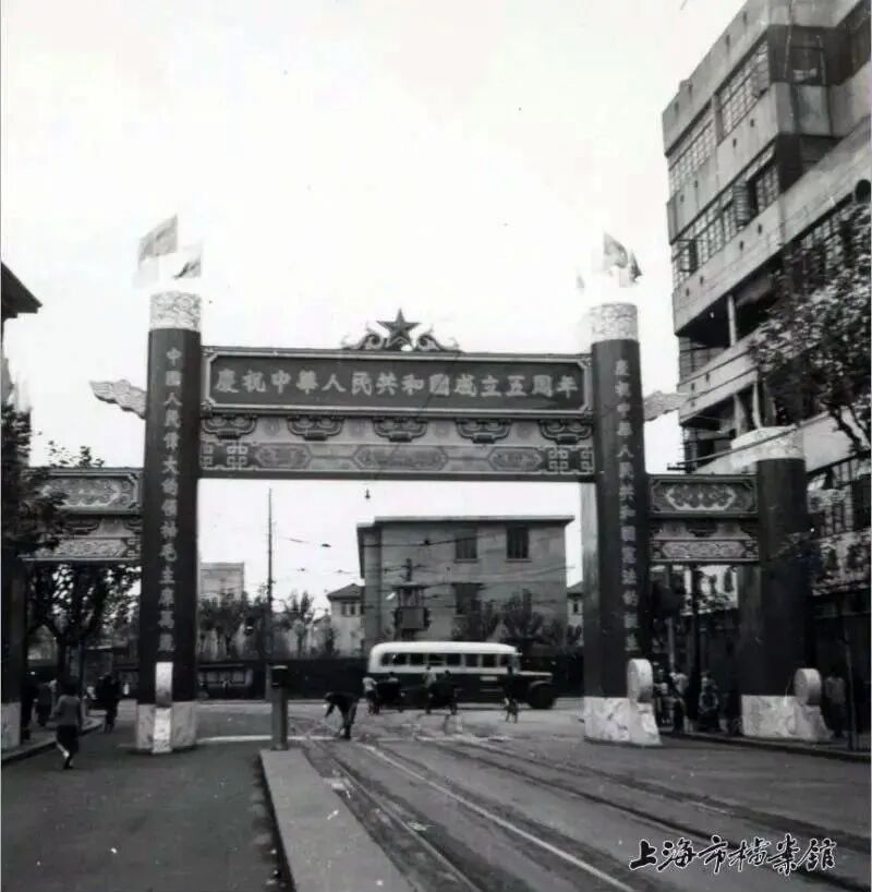 1954年的淮海中路、常熟路口搭建了牌楼。