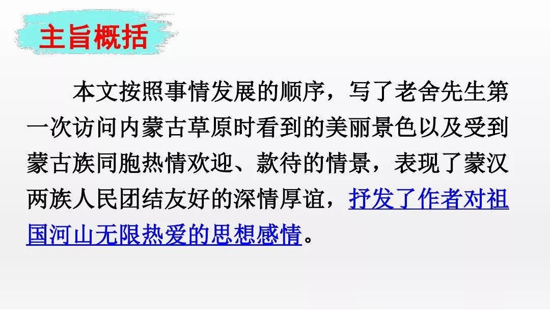 本文是作者第一次访问内蒙古大草原时的所见、所闻、所感,写了草原的美丽景色以及受到蒙古人民热情欢迎、款待的情景,赞美了草原的美丽风光和民族之间的团结,抒发了作者对祖国山河的无限热爱之情。