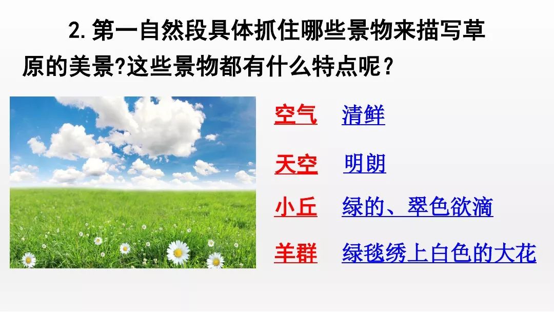 3.自由读第一自然段,思考作者初到草原看到了什么景物?这些景物有什么特点?