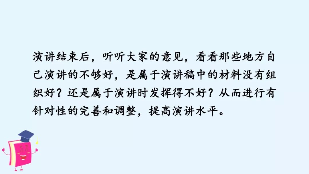 演讲要注意的一些地方:演讲尽量脱开稿子,或者半脱稿;站立姿势要大方,不忸怩;精神饱满,声音洪亮;语速要适中;要注意眼神的交流。