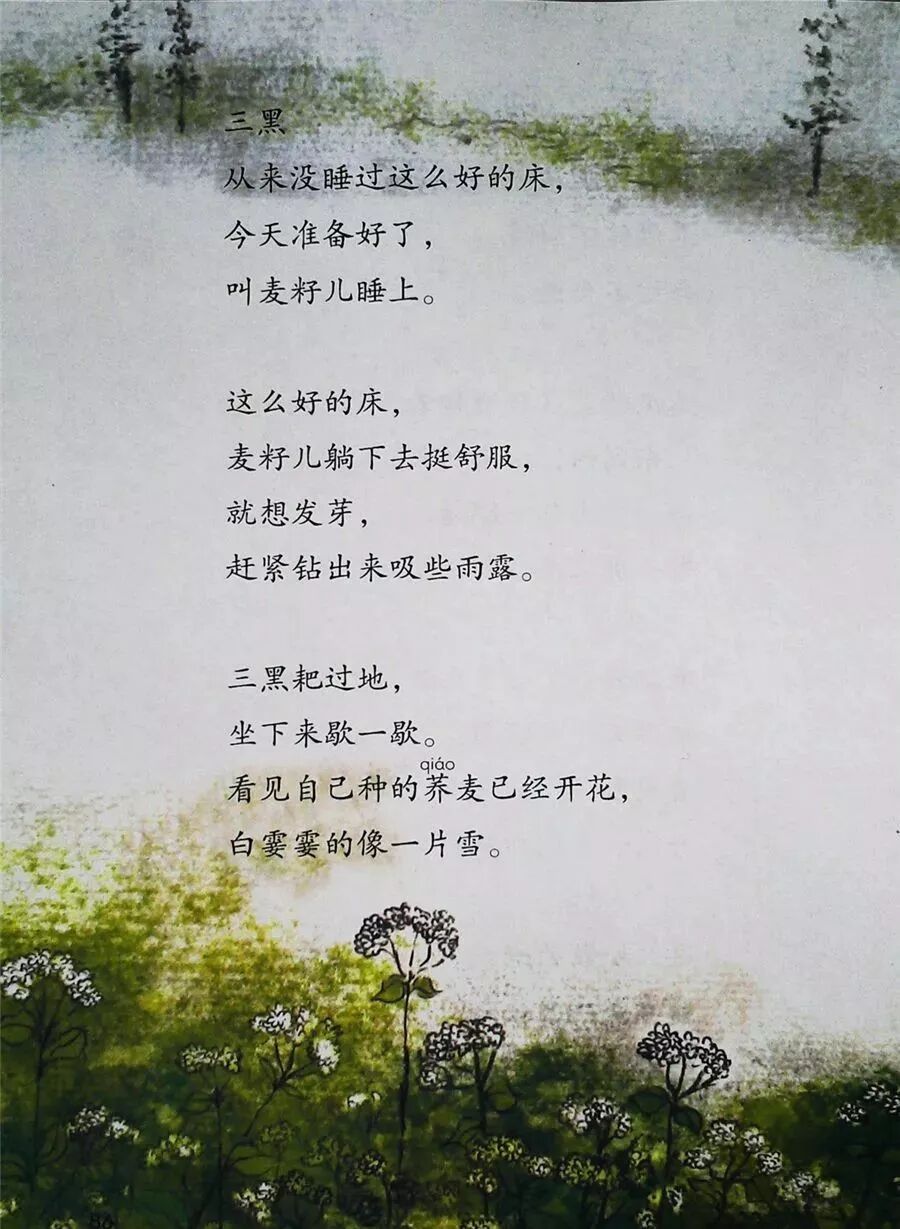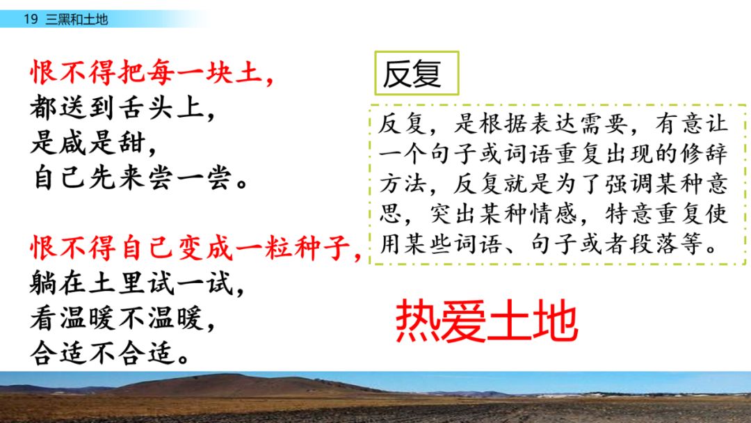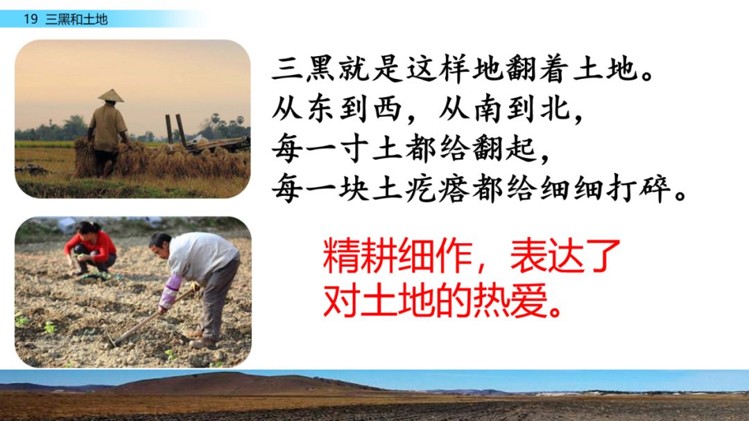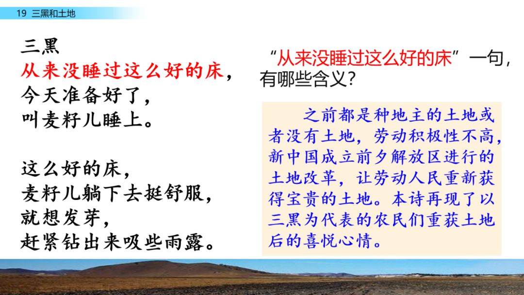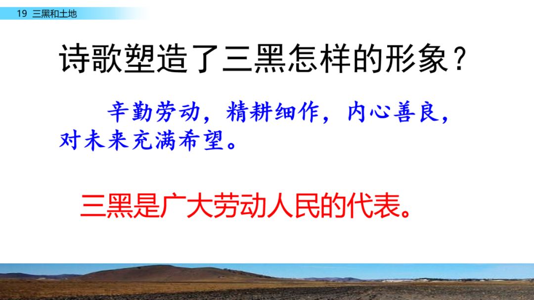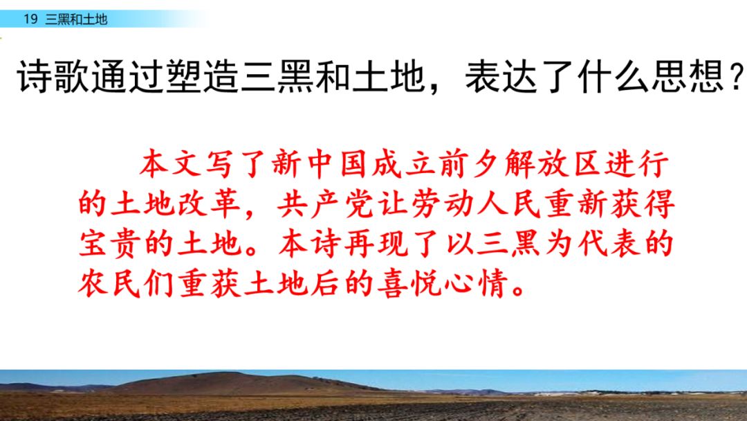 诗歌通过描写三黑的田间劳动,表现了农民对土地的热爱之情,还通过新旧社会的对比,体现了农民获得属于自己的土地之后的幸福与喜悦。