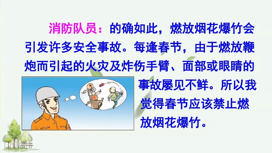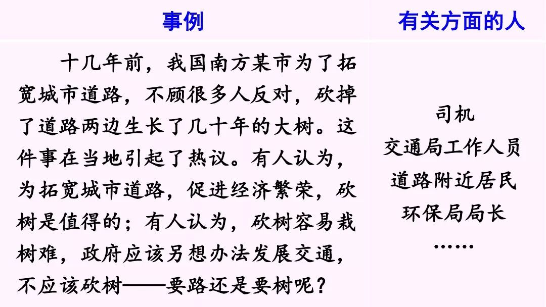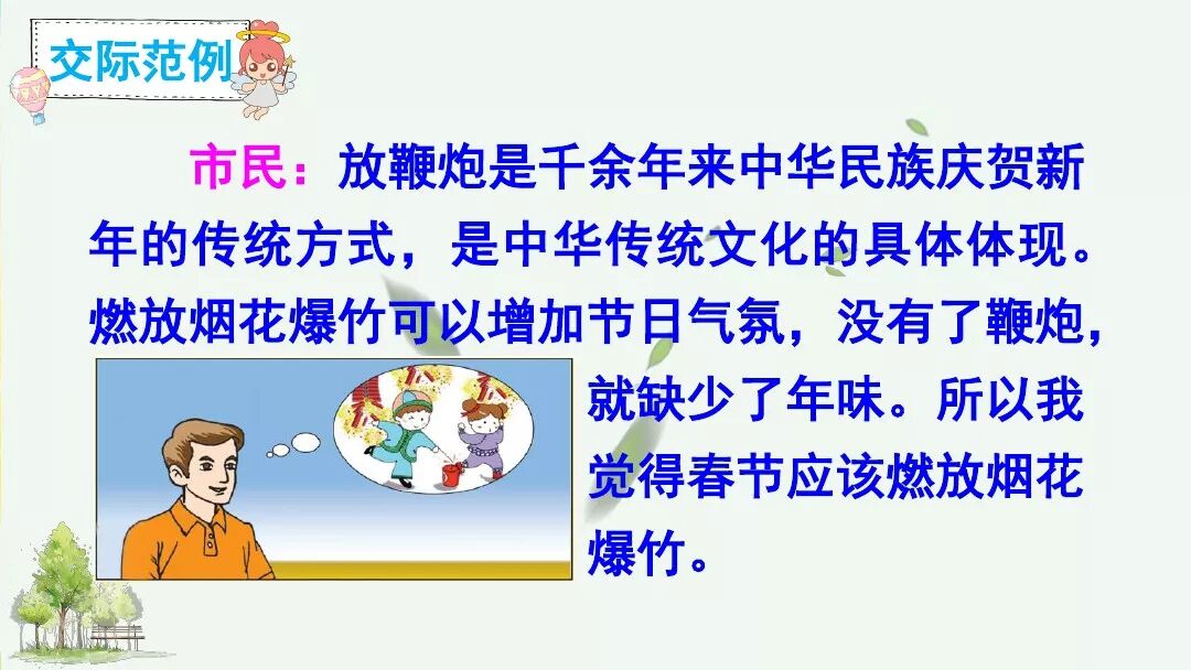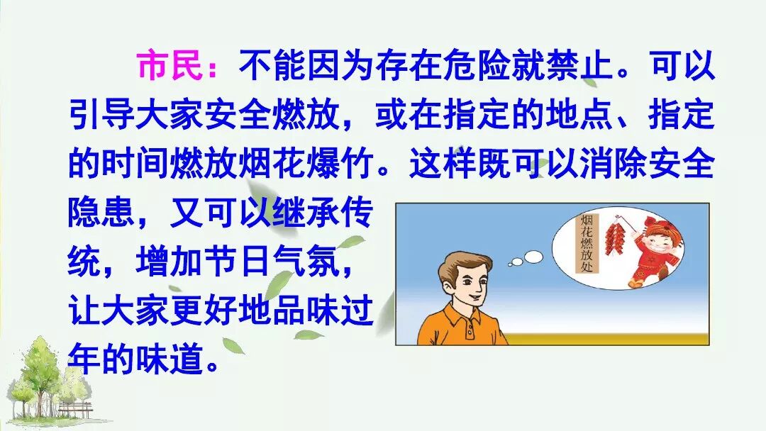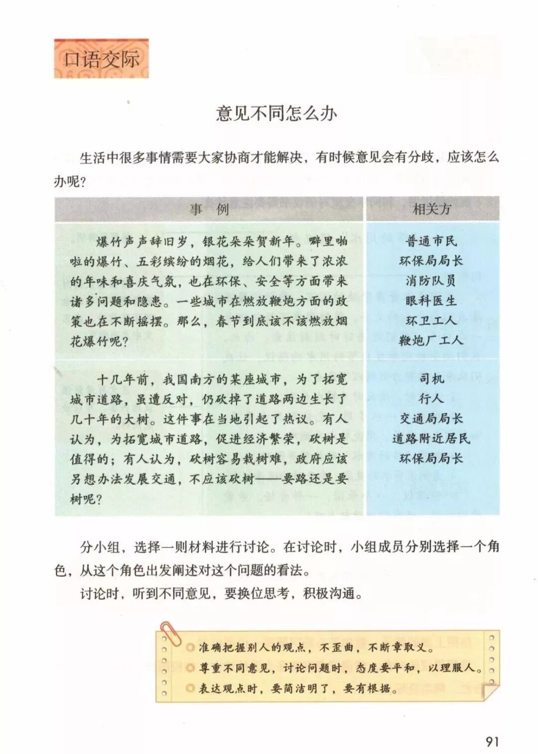 仔细阅读材料,想一想,材料中要解决的主要问题的相关方都有哪些?他们的主要工作任务是什么?你最了解哪一方的工作?作为这一方,你认为“燃放烟花爆竹”或“要路还是要树”对“我们”哪些方面有利,哪些方面不利?可见,本次口语交际的问题来自生活,涉及面十分广泛,影响各行各业。