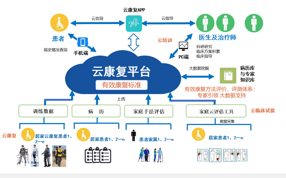 所以康复智慧云平台的建立,是未来一个大势所趋,也是必然要经历的一个阶段。它通过云平台把患者、医院,还有治疗师、医生这三端给结合起来。不仅是进行合理的训练,还可以把训练数据都完全收集起来形成大数据。通过专家的引领,通过大数据支持,最后形成有效的康复方法评价和评测体系,最终支持全国智慧化康复体系的建立,让整个康复向更好的方向发展。所以未来外骨骼一定会越来越先进,越来越方便,一定能大有可为。