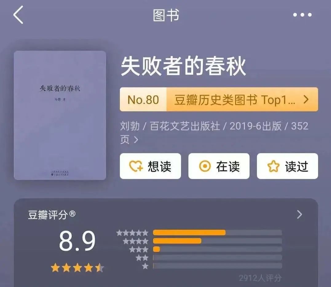 许多人追着看他的书。他的《失败者的春秋》比《战国歧途》豆瓣评分还高,达到8.9分。