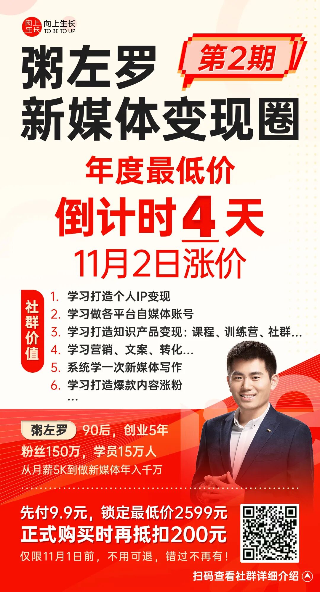 About Feature 新榜年度最具收藏价值公众号TOP10,90后北漂创业5年,白手起家持续逆袭,从月薪5K到资产千万,个人成长、新媒体专家,长期研究并实践“普通人如何在这个时代通过持续成长改变命运”,自媒体粉丝150万,做课程7年,学员15万。