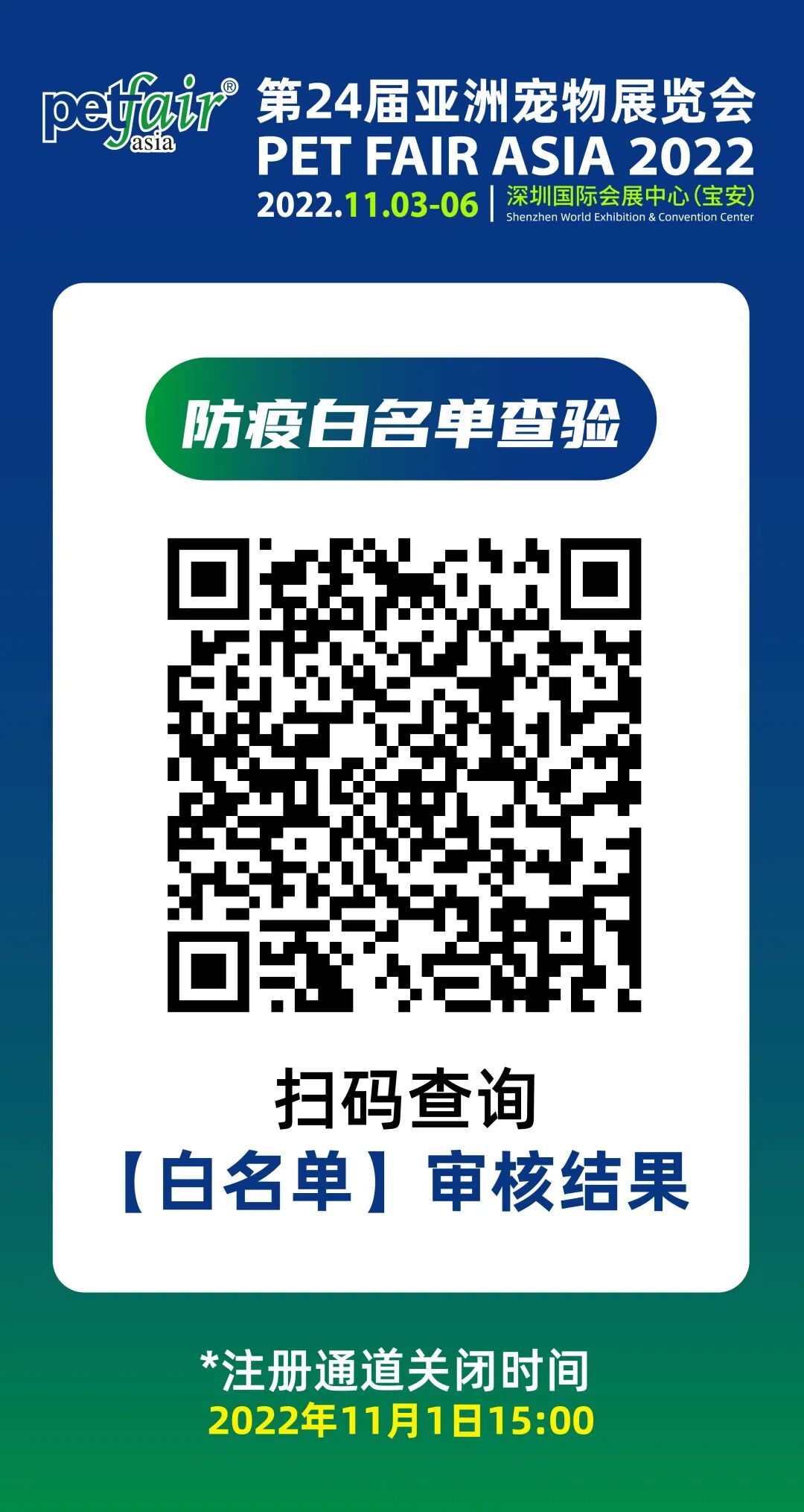 申报方式:所有人员需在11月1日15:00前完成实名注册,进行“白名单”审核,通过相关防疫部门审核的白名单方可入场,请使用与身份证一致的姓名和本人手机号登记,并于现场携带身份证入场。