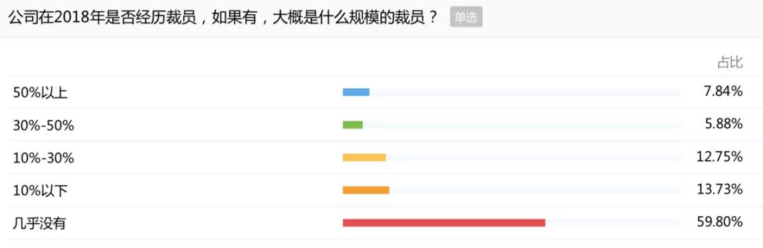 事实上,2018年,“失业”几乎成了笼罩在所有职场人心里的阴霾。在36氪与清华大学全球化研究中心、民智国际研究院共同发起的《创业者生存现状调查》中,29.41%的创业者为了抵御寒冬,决定“减少招人,或不再招人”;而已经有过裁员行为的公司,占比达到四成。