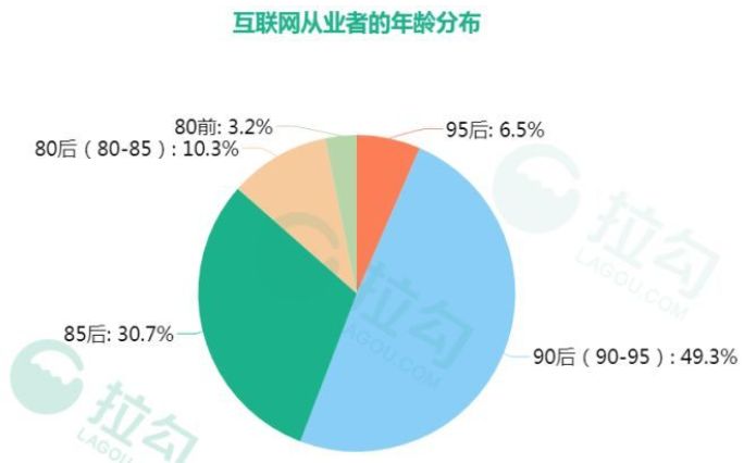 对于互联网行业而言,无论创业还是就业,越来越成为年轻人的天下。2018年9月,拉勾网发布的《90后互联网职场报告》显示,互联网行业平均年龄26岁,其中,55.8%的互联网从业者为90后,其中90-95之间的,占比49.3%。