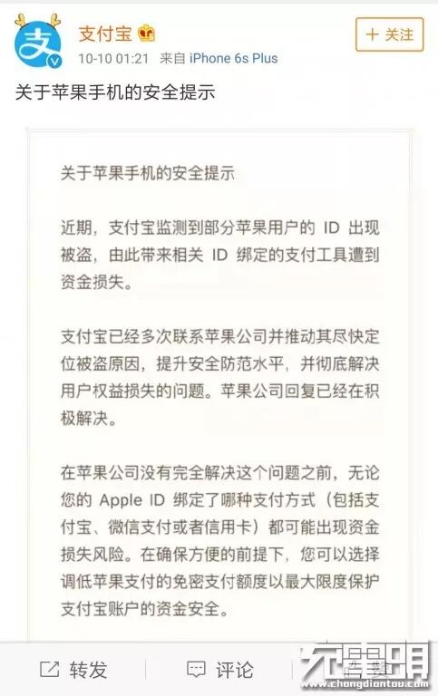 时隔近两月,就在今天,支付宝官微发布关于苹果手机的安全提示,称监测到部分苹果用户ID被盗,由此带来ID绑定支付工具遭到资金损失。