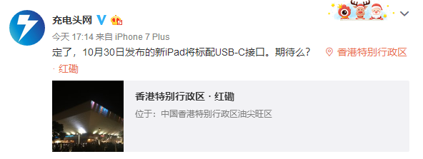 今天著名科技数码博主@充电头网发布了一条微博:定了,10月30日发布的新iPad将标配USB-C接口。