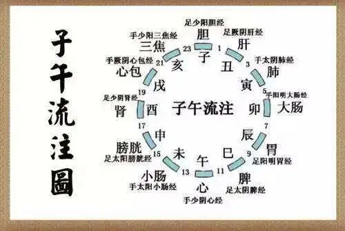 肺寅大卯胃辰宫,脾巳心午小未中,申胱酉肾心包戌,亥焦子胆丑肝通。
