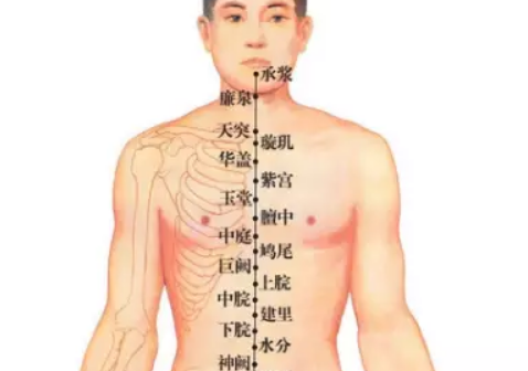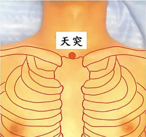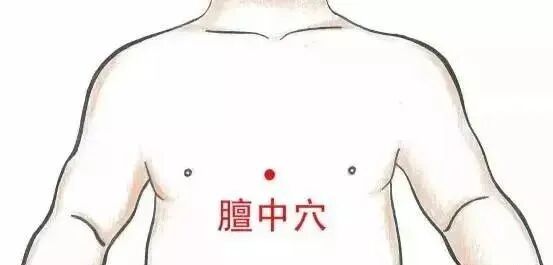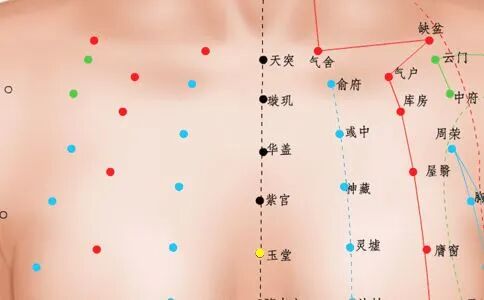 先找天突,再找鸩尾,这两个穴道,正中间是膻中(本处有误,当为玉堂——校对注)。 诸位看书上膻中穴,气会膻中。现在诸位学到了,腑会中脘,气会膻中。膻中穴的找法,书上说也可以在两乳头中,但你不能只会这个找法,不然女孩子怎么办,如果女病人是 A Cup 还没关系,如果是 D Cup 的两乳中间,跑到中脘穴,所以不能靠乳头去找。找到膻中以后, 要找中庭穴就很简单,膻中下一寸半,或一寸六,你一摸中间有个凹洞,就是中庭,中庭知 道大概位置就好了,几乎用不到。膻中穴就用的多了,足太阴少阴手太阳少阳之会。气会膻 中,气病治此,呼吸短促,气喘在这里治,但禁针,要用灸的。过去呢,因为针太粗,但现在针很细,下针没有关系。肺痈 吐脓,呕吐涎沫,妇人乳 汁变少 。现在看中医的书就知道,都在陈述症状。病人咳了半天,乳汁变少,都在膻中治, 因为气会膻中,气是阳嘛,强他的心脏、强他的肺气,效果都很好。那所谓肺痈,我们有两 种,一种是里面化脓,化脓的时候,咳出来的是很浓稠的脓。如果咳出来白色泡沫,完全是 白的泡沫,那是肺癌了。那气病呢,都可以在膻中上治。更正更正,这两个中间呢,应该是玉堂。玉堂下一寸半才是膻中,膻中下来才是中庭,天突和鸩尾穴中间是玉堂穴,玉堂下来一寸半才是膻中穴。那中庭和玉堂都是辅助膻中穴的, 没有膻中重要。那玉堂再往上去,和天突中间的穴道是华盖,华盖和玉堂中间是紫宫,华盖 和天突穴的中间是璇玑。所以我们取中点,平常玉堂、华盖、璇玑都只要知道穴道在这,很 少用。但膻中穴就要知道了,膻中会用到。