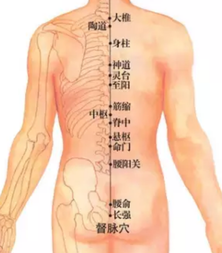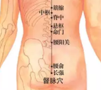 督脉第一个穴道是长强穴,是足少阴、少阳之会,这个穴是痔疮 的根本。怎么找这个 穴道呢?让病人躺在床上,在尾椎骨的下方,肛门与尾椎骨的中间。长强穴下针的时候,采 斜刺。长强穴,无谓补泻,引气到就好了,下针不用太深,一寸左右。主要是治痔疮。医书上有很多痔,什么长的像桃花就是桃花痔,还要怎样分治疗,其实不用。痔分两种, 一种是内痔、一种是外痔。内痔时,中医定义它,是先血后便。大便的时候,血排出来后, 再出大便,不会痛。外痔呢,是先便后血,上完厕所,一擦屁股,看到流血,这是外痔,先便后血,外痔会很痛。长强穴,不管内、外痔都可以治疗。像痔疮就是个非常好的治症,不 管是针、灸或中药。如果你觉得人生乏味,就去给西医开刀。肛门那是浊物经过的地方,很不容易收口。所 以你觉得人生很好,就不要开刀。开刀后产生瘘管会很难过,女人阴部跟这个就会连在一起, 阴部就会排大便,而且滴漏不止。痔疮很痛,但也不会死掉。到现在还没有人因痔疮死掉的, 痔疮其实很好治。下针时内痔看不到,外痔时,肿得很大,用三棱针来刺它放血,放血时, 可以用小一点的火罐把痔疮吸住,把脓血抽出来,把痛去掉,痛就是瘀血累积才会有痛。很 多穴道都可以治痔疮,长强是个大穴,内痔效果也是很好。督脉第二个穴道叫腰俞,这脊椎骨在尾椎上是成三角形的,在尾椎骨上,在脊椎交接的 地方,第二十一椎,我们叫腰俞。腰俞可治月经不来,其实我们有非常多的穴道可以治月经 不顺,不一定要在腰俞治,很少用。诸位知道这个穴道就好了,我到现在没有用过。长强就很常用了,那个痔疮痛起来时,很难过。当然我们痔疮放血时,要带橡皮手套放 血。放血时,当然用火罐小一点的,这是基本常识,再来是阳关穴,在找阳关穴时,先找命门,命门是第十四椎。看侧面的图,肚脐正对面 的穴道是命门,从命门下两椎就是阳关。阳关穴和命门穴,先找命门,再找阳关,一个是第 十四椎、一个是第十六椎。阳关穴很少用到。阳关穴针灸都可以,像治腰痛时。命门穴针和灸都可以,剧烈的头痛,中医讲的角弓反张就是脑膜炎 ,在命门上都可以 治疗。命门穴顾名思义是生命之门。练功夫的人在肚脐下三寸的关元和命门,先观想成一条 线。吸气时,这条线往下沉,这条线沉到会阴的地方。吐气时这条气往上升,升到顶的时候, 再吐最后一口气,再提肛门。肛门在医书叫榖道,说起来比较优雅。提肛在练功是最后一步。比如说你在吐气,吐到后来没气了,你以为结束了,其实才刚 开始,要到最后在没气时,再把肛门提起来。平常小便,男女都可以用,从小就要教你的小孩子,不要随时跑去小便,你要等到饱满 时,扣不住了才去。在小便时,要大力地排出来,成为反射动作,大力地尽量排,要让力量 很大,养成习惯时,每天都在运动下焦,就会长命百岁。把气逼出去发一点声音都没有关系。这个悬枢呢,在第十三椎下。在讲督脉时都是指第几椎下。在触诊摸背后的时候,会摸 到一个凸,两个凸的。这个凸的才是椎下。因为骨头是这样子的,下针要在软骨下,所以凸 起来的才是椎下。悬枢呢,治症跟阳关差不多,治腰痛 等等。三焦经会经过。 脊中这个穴道只能下针,不可以灸。第十一椎下周围是脾脏,这穴道主要是治黄疸 、 便血 。因为它在脾的正后方。以后会学到膀胱经第十一椎下外开一寸半,是脾俞。脊中我 们大部分是下针。怎么找第九椎呢?这个背面,人体的背后,背后两个肩胛骨,这个脊椎骨在中间,两个 三角形的底端画条线,交错过去的就是第七椎。病人是以趴到且手肘垂直上举的方式。这样 子交叉到的是第七椎,要注意是背面,若看图易误解,不是正面而是背面。往下摸,突起就 是第八椎,再下突起就是第九椎。第九椎是筋缩。全身上下,肝主筋,全身的筋是肝脏在管。这个穴道正在肝的后方。督 脉的穴道除了治病以外,还可帮助诊断。介绍膀胱经时,会回来介绍这些。筋缩用针和灸都 可以,像治癫痫 狂。