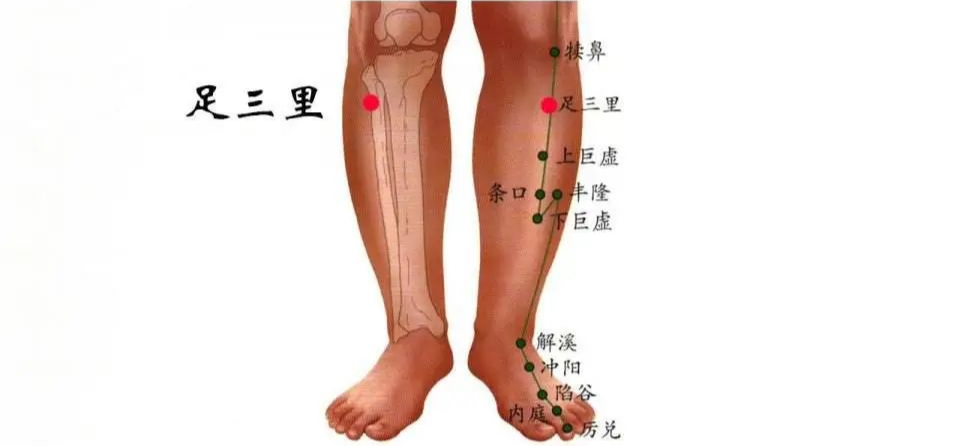 足三里是非常常用的大穴,所有胃病 都可以治(但吐血除外)。有个穴道叫冲阳脉,找 到足三里,按住足三里,冲阳脉就没了,这代表你找到穴道了。我们叫度骨法,就是按照骨 头来找。一般中医的观念是男人年过三十,多灸足三里。足三里是胃经的合穴,井荣俞经合嘛。 阳经的合穴,五俞穴是金水木火土。合为井荣俞经合。那足三里这个穴,胃经本来就是土经, 胃经的本穴就是足三里,属性相同。病人恶心想吐,扎足三里就去掉了,除非扎到足二里、 足四里。有人脚不能走远,扎足三里。脚没有力扎足三里。灸和针都可以用,灸百壮都没有关系。 它可以把燥热的气导下来,比如灸中脘、关元,灸得太过了。想要超过那个老将军,就灸五 百壮,灸得很黑,灸到口干舌燥怎么办?再灸足三里,它会把热往下导。后面还会介绍到灸膏肓穴。灸的时候,感觉很燥热,我们就灸足三里,把火气往下导。
