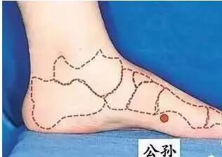再来是公孙。公孙用途非常多,所以你们务必找得到穴道。穴道非常好找,我们脚掌这个地方,有凸起来的骨头。我跟各位讲只要用度骨法来找,穴道就不会找不到。在凸骨的下 方跟肌肉交接的地方,这个穴道就是公孙。公孙主冲脉。冲脉呢?按照人身上,在任脉旁开半寸的地方,是冲脉的所在。有一句针灸的歌诀,叫 “公孙内关胃心胸”公孙穴配上内关穴。内关在手心包经上面。任何的胃病 、心脏病 、胸 部的问题:气喘 、咳嗽 、肺病 、心脏肥大 ,公孙通通可以治。你要问病人什么病时,因他一直喘,无法回答你。公孙内关针下去,就可以跟你讲话了!要先把喘定住,才能问他。不能一直问他,又让他一直喘。