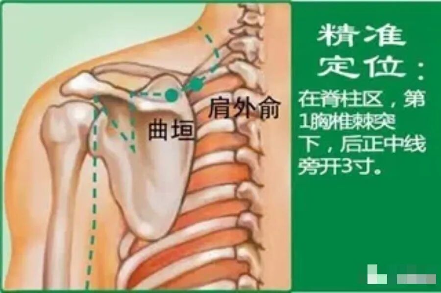 肩外俞是从陶道外开四寸的距离。肩中俞是从大椎开二寸。左边右边都有。 肩中俞,我们扎背针的时候,下针的方向是从身体内侧对身体外侧方向下针,呈八字形。