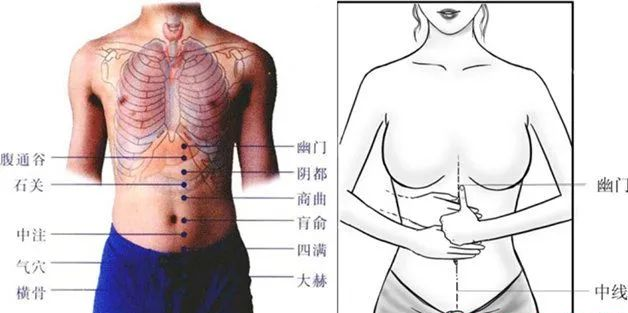 所谓的近取穴最简单记的方法,它只有靠近大肠的地方,一般来说都可治大肠的问题。 靠近腹部这边,就是小肠、膀胱、女人的子宫胞户、卵巢等,治疗妇科的近取穴,或男人小 便问题等等,诸如此类。所以你只要记得近取穴都是在附近,这样就不会错。这是近取穴的 观念,接近心脏的,就是治心脏,接近肺的,就是治肺,这是近取穴的观念哦。所以,观念 一定要有。再来是商曲在下脘穴外开一寸。跟诸位复习一下,肚脐(神阙)上一寸是水分,水分外 开一寸没有穴道,下脘外开一寸是商曲。![]()
