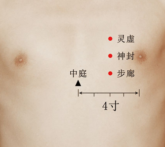喂母乳的时候,我们知道胸部的乳房里面是三焦的气脉集中处,到了再从这走,往这走, 这时候我们加强她心脏的力量,加强足阳明胃经的经气,比如说解溪、梁丘(止痛)、心脏 的募穴巨阙,让那个奶水集中到乳头出来,因为是在喂母乳嘛!因为肾经跟胃经之间,里面 有三焦在联络它。下堂课我会介绍到三焦经,三焦行阳,所以奶水都是阳,阳就是白色的。 你如果看到黑色的就是阴,黑色的就是乳癌了。小孩子不会吃黑色的。你看到奶水是白色的, 这就是阳,有三焦经在联络它,它会集中到乳头出来,这时候你去强心脏。但如果不是喂母 乳,她有个硬块在肾经上面,初期硬块用灸的当然很好啊,灸本来就是找水,如果这化瘀了, 初期硬块一定是钙等等的东西累积在那,实际上就是营养留在那里。我们就灸它。如果是肾 经,当然在肾经上下针啊。如果硬块才一个星期,又很痛,这是实症。如果是实症的话,在肾经上下针,如果你很讨厌这个女的就下涌泉,忘了然谷了嘛!如果这太太每天行善,就用然谷。如果说是虚症,就在复溜。病很久了,按了很舒服,复溜上下针。这是我们在临床上 选取穴道的方法。两乳中间是膻中,下一寸六是中庭,中庭外开二寸,每隔一个肋骨,就有一个穴道。隔 一个肋骨,就是《针灸大成》上的隔一寸六的单位。中庭外开二寸,就是我们的步廊穴。书 上讲胸肋痛等都可以在这治。 再来是神封,神封穴书上把它印在步廊穴下面去了。神封穴很接近膻中。你把步廊穴隔 一个肋骨,就是神封。所以很多人乳房的硬块是累积在神封这边,我们要在肾经上治疗。治硬块初期时,效果 非常好。所以女人初期乳房硬瑰,中药处理得当,就不会得乳癌,一开始就该处理。最简单 的方法就是天应灸,哪边痛,哪边有硬块,就找天应嘛!甚至于只要教她怎么灸,让她回去 自己灸都可以,晚上没事看八卦新闻,就顺便去灸。看电视很开心,一开心郁气就散了。书上指神封穴治咳逆 、乳痈 ,乳痈就是乳房硬块。神封穴再隔一个肋骨。就是灵墟。 灵墟在玉堂外开两寸。玉堂穴外开二寸就是灵墟。治症都是一样,治咳嗽、胸满。灵墟再往 上一个肋间,属于任脉外开二寸的地方,是神藏穴,神藏是紫宫外开二寸,彼此治症差不多。俞府跟彧中,俞府是璇玑外开二寸,彧中是华盖穴外开二寸,俞府是肾经的最后一个穴 道。临床上,扎俞府跟彧中时,刺法是这样子刺。一般来说,如果说这是穴位,这是任脉, 如果是在外开二寸的地方,我们都是在一寸半的地方进针。用这个角度,针下在一寸半的地 方,从一寸半下针。针下去的时候,肋骨在这边,要下在肋骨交缝的地方,不要从两个肋骨 中间扎,这样就不会伤到肺。你如果扎得很深就会扎到肺。扎在两个胳骨中间,就不会扎到 肺了,从一寸半往二寸扎,要用这种刺法进去,扎在两个胳骨中间。气喘、咳嗽,几乎都可以治。它没有所谓的木火土金水,它没有穴性的问题,它是天应, 取近取穴的时候,发气喘时,你不用管它是实的气喘还是虚的气喘,也不用管是热的气喘, 冷的气喘,就因为是近取穴的缘故所以用它。但是你唯一要知道的事。他的气喘若是吸入困 难,要在肾治疗。如果是吐气困难,要在肺治疗,以治肺为主。所以,气喘在处方跟下针上 通通不一样。写留言