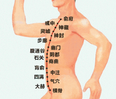 神阙呢,到心蔽骨属任脉,肾经是外开任脉一寸,过去有人讲五分,临床上看是一寸,因为我们讲经络一定在肌肉跟肌肉中间,而一寸这刚好有肌肉。我在国外看过很多肌肉男,肌肉都一寸一寸的,肯定是一寸。在神阙旁边一寸是我们上堂课讲到的肓俞。肚脐旁开二寸是 天枢,天枢是足阳明胃经。肾经的走向正好等于冲脉,与冲脉相等。所以你要知道在这条经 上的问题,就在肾经下手,这能帮助你诊断,当然也属于冲脉。