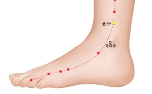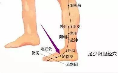 光明穴是足少阳的络,别走厥阴。胆经是个很大的经脉,很多穴都络出去。光明穴也是 络穴,我们用光明穴,络厥阴。大部分是用在眼科的治症。所以,治眼科像眼旁的瞳子髎、 丝竹空,攒竹、睛明、承泣,四白,养老,现在又来一个足少阳胆经的光明穴可用。光明穴 是外踝裸上五寸。从这上五寸的地方,就是光明穴。顾名思义,眼睛大放光明的意思。下针 用直下。下光明穴时,你们压到里面一个胫骨,一般来说是下在胫骨的这侧,而不是在胫骨 上面,也不是在胫骨这侧,这是属于胆经。在胫骨后倒是膀胱经,靠近最前面的那个骨头是 胃经。由于它是络穴,虚症实症都可以下针。胆是阳木,胆经对应着井荣俞原经 合。阳辅穴是经穴。因为是阳木它的属性是金水木火土,原穴跳过去,金水木火土。胆经是 木,它的经穴是火,所以阳辅穴是胆经的子穴。胆家的实症在这下针。前面所说的阳陵泉是 胆经的合穴,阳辅穴是胆经的经穴,也就是子穴。如果病人来找你说,我这个偏头痛,痛三 天,是实症,就在对侧的阳辅下针。你现在知道,经络是由上往下走的。我们下阳辅穴时是 逆的下针,迎着经络的走向下针。所以,你要在阳辅穴下半寸针刺进去,才会扎到阳辅穴。 所谓的实症,实则泻其子,胆家的实症,通通在这治疗。这是我们常用的大穴。外踝裸上三寸,我们叫悬钟。它另外一个名称叫绝骨穴。绝骨也叫悬钟穴。绝骨穴,按 照《难经》:髓会绝骨。骨髓的髓,髓生病的时候,在绝骨穴上治疗。绝骨穴怎么找?过去 我们手按到外踝,顺着外踝沿着骨头一路上往上推,推到上不去而陷下去的地方,那个陷下 去的地方就是绝骨。所以说,三寸是一个形,有的人这骨头很高,有的很短。我们是以度骨 法,就是按照骨来度量它。从外踝摸到绝骨穴,如果你绝骨穴很高,就表示你很聪明。你绝骨穴很短,就是笨啊, 若你绝骨穴只有二寸,那你天纪就不用上了。面试时我要摸摸绝骨穴,很高的再来。一般标 准,是二寸,但有人的很高,有的很短。所以可以看他的脑容量,越高的脑容量就越大,因 为髓会绝骨,脑为髓之海。以后《黄帝内经》会介绍得更深,你们先不要问。如果髓之海突 然多个东西,那就是脑瘤。你先知道这里,深入的我们《黄帝内经》会讲很多。基本上,在 这你要学到髓会绝骨。 骨会大杼,筋会阳陵,阳陵泉是胆经的穴道,大杼穴是膀胱经上,在陶道外开一寸半。 血会膈俞,在第七椎外开。气会膻中,脉会太渊,脏会章门,章门穴在肝经上面。腑会中脘, 这是我们的八会穴。剩下一个脏会章门还没讲到。这是髓会绝骨,所以骨髓生病绝骨穴会有 压痛点。绝骨穴也是治疗中风 的大穴。所以,中风的时候,我们在腿上下风市,阳陵泉, 绝骨。中风中脏时,所谓中脏,最深的叫脏。如果中络就会肌肤不仁,因只在肌肤表面,你 针就下得比较浅。那不能讲话就是中脏,那你就下到骨边。一个穴道一个穴道的用三寸针, 扎风市、阳陵泉透阴陵泉,绝骨穴,对面是三阴交,由绝骨透到三阴交去。若小腿比较短, 用三寸针会穿过去,你刺到对面皮肤表面,就不要穿刺出来,可以碰到就好了。这样透针才 有效。所以任何骨髓有问题通通可以下针。筋骨的问题,统统可以在绝骨穴上下针。绝骨穴 又名悬钟穴。 再下来是丘墟穴,脚的胫骨到底下,快到脚掌骨上面的时候是弯的,在这个交接的缝里, 就是丘墟穴。我们很有名的脚踝裸扭伤治疗是由商丘透丘墟。一不小心脚扭伤,我们就可以 用商丘透丘墟。商丘是脾经的子穴,透到这里的丘墟。透这个穴有个技巧,你现在摸绑鞋带 的地方,在这有两条大筋,像从商丘穴经这两条筋的下方穿过去,从商丘穿刺到另一边的丘 墟,用一寸半针就够了,专治脚扭伤。丘墟穴是胆经的原穴,胆经的虚实都可以在丘墟上治疗。里面讲眼科,眼睛生翳、眼睛 不好从眼睛上面下来的薄膜,你都可以在丘墟穴上治疗。因为丘墟不分虚实,这是它的原穴。 所有的阳经都有原穴,为什么,因为全身的三焦,包括上焦中焦下焦。三焦油网密布全身, 三焦是行阳的,是阳气走的地方。所以说因三焦而有原穴。在三焦经跟六条阳经交会的地方, 就是原穴交会的地方。所以阳经才有原,阴经没有原。这是三焦的关系,三焦只走阳经。所 以当初定为原穴,就是讲三焦经,这是源头。由脚下来,这是外踝裸,这是左 脚脚掌。这个交接的地方就是胆经的丘墟,这边是商丘。由丘墟走下来,在脚小趾就是第五 脚趾骨的地方。把这脚趾头拉一拉,你会发现到有个筋在这边,在这条筋的后方这个穴道, 就是临泣。我会 DEMO 给你们看。这临泣穴是在两个骨头的中间。它有一个角度,这角度 大约是这样子,从这个角度,这一刺就到临泣穴了。临泣穴主治带脉。所以有个病人找你说:“我腰痛 ,但我这腰痛是横到一圈痛,像皮带 一样”,就下临泣。你如果下到临泣,这痛是当场去掉的。若你没扎到,就还是会痛,痛就 是去不掉。如果病人说,我脊椎骨痛,在脊椎骨这旁边有一点点痛。就下临泣,同时下足三 里,这是治脊椎旁边的华陀夹脊。从临泣穴,跳过这个筋的前面,就是地五会。再往地五会走到脚趾骨,这交接的地方, 就是第五和第四交接的两个高骨下方,这个穴道,我们就叫做侠溪穴。我画大一点给你看。 从侠溪再下来的最后一个穴道是窍阴穴,脚趾头最外面是至阴,至阴是膀胱经的井穴。在这 里第四趾头的内侧就是窍阴穴,也就是胆经最后一个穴道。临泣穴