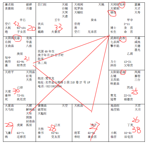 提出这一张命盘的目的呢,这是一个格,这个男的命呢,命宫在丑这里,贪狼武曲,化权化禄,这个贪狼武曲,我们除了主武官星以外,还可以主财星,所以生下来,就是权禄,这是豪门巨富啊。生在家里面一定很有钱,诸位呢,我们最好的命是怎么样,就是早年比较凶一点,吉星在后面嘛,这样才好嘛,那这个生下来,太好啦,太有钱了,就像我们蒋家三兄弟一样,太好了,我怎么会有事呢,我就没有戒心了。诸位看,他的父母宫是巨门太阳,巨门就是豪门,家业都很好的,命宫化禄都是家里财富很多,可是这个是先天啊。生下来。后天,你看看他的财帛,是廉破,官禄宫是紫微七杀,所以他如果呆在本地的话,他是从事武官的,一个生下来享有祖业,还有一个后天的官禄是紫微七杀,会从事武职,这个财帛宫是廉破,不可能会去自己做生意,完全不可能。那我们看他流年行运,42岁以后进入廉破,这是煞星,对面还是天相星落陷,还有地劫,煞星在对面,这个福德宫主一世的福禄,结果煞星来会,未来十年52-61是不是化忌。这个八字拿出来的时候,我问说你这个八字有没有错,为什么,在45岁就是大限了嘛,为什么,因为未来十年没有大运,大限是不是在前十年,是在42-51,那未宫是59,58,47,46,45岁是不是在卯这里啊,45岁对冲,对面是廉破,刚好是十年的对宫,然后煞星落陷,煞星落陷代表是无解!这个很凶的。45岁就该买单啊,走人啦。我告诉你,他45岁的时候,得了大肠癌,刀子一开下去,哎,人家大肠癌现在世界上的存活率最长是5年,后来移转到肝癌都死掉了,哎,没死哦,这个没有死,是祖上有德!可是没有死以后呢,诸位想想看,你再转一圈,是不是12年,那45加12,是不是57啊,那没有错的话,那应该是57岁走人啊,他57岁没走,出一个大车祸,廉破啊,化忌啊,出一个大车祸。也没死!可是因为他在42-51岁动了刀子,到了52-61大运,我为什么提这个,重点哦,诸位,流年逢到化忌的时候,这种煞星化忌,不管你,什么都不要谈,光讲事业来说的话,完全是停摆!这个八字,整个格,最好的宫在哪里,在夫妻宫,太太是天马,男人的命里面,如果你的命中夫妻宫是天府带天马,你最好感谢你老婆,你这个辈子什么决策都是错的,娶个老婆娶对了,天马星是吃苦耐劳,为你奔波啊,天府星是很善于理财,因为很厚道,拼命做事情,人又很善良的一种人,有非常善于理财,你娶个老婆廉贞贪狼落陷看看,入庙没关系,落陷看看,家里什么都赌光,跟你讲。煞星一煞弹回来没办法做了,弹回来,外地是擎羊和左辅右弼,你是不是只能去帮人家做事情,然后慢慢做事情,到45岁,身体凶啊,所从45岁开始一直没有做事,到61岁,那到61岁在那里是在没事干,就跟朋友帮忙出来做啊,62-71是进入权禄,有没有,所以因为这个灾逃过去了,所以他过去的流年,一直在命上面走,今年来找我们算,民国83年,是不是66岁啊,66岁在子这边,挺好,67,68,69岁是不是有是卯这个,57加12是不是69。男人啊,上次讲过,男人九是老阳,女人呢,六是老阴,阴的极限。所以男人很多是逢九买单。他刚好69岁逢到卯,进入这个大灾,69岁是大限。那他20多年前开刀到现在,他装一个人工肛门带到,一直带在身边,69。诸位你看他的阳宅才妙。这个人的太太非常好,可是你看这个人的个性强不强,这个人的个性是最刚强最固执的一种人。你根本不要跟他讲,他说我不信这个!所以我说无知到哪里,不懂却要讲结论,懂不懂。不懂没关系嘛,不予置评,我不懂嘛。阳宅是这样子的,他是切两半,门从这边进来,这里有两间房间,这里是厕所,这里是厨房,然后房子,东南西北在这边,西北角刚好是一个什么,走道!还有厨房,沾到,卧房也沾到,这个房子就一直住下来,所以在这个房子,看的时候,本身没有先生的位置,对于这个家来说,这个房子,本身得不到先生的助力,成家的不是先生,一家之主不是先生,缺位,看到没有,如果厨房在西北方正中的话,那就买单了,走人了。厨房在偏一点。我们现在帮他改的时候,诸位注意看,我们帮他厨房改成长条形,厕所移到这边来,这个房间加大,原来的房间,加大到厨房一半这边来,刚好满在西北角上面,看到没有,然后他东北方是不是朝这里,所以我们改床在这里,朝他最好的方向来睡。头在这里,脚朝东北。因为他还要做事啊。这个八字,所以遇到这个廉破流年的时候,所以诸位要记得,帮人家算命,流年不好,一律鼓励人家去读书,去深造,去进修,读书是人最愉快的事情,会忘掉很多事情。让自己成长,这个流年。那你知道这个过程哦。对面是化忌,我们光以化忌来看,化忌是不是来冲到父母宫,所以,以化忌来说的话,他的父母宫刚好太阳星独守,是不是,光以他的八字来看的话,是不是父亲先走,再来走母亲,爸爸要先走,因为对面是化忌来冲,对不对,这是看父母。还有66岁,流年在子这里,67岁第二年,是不是很好,这是看小流年,你从66年跨入这个流年,未来这一年是不是很好,未来一年流年很好,这已经是果,他的因是在66岁这一年,所以他66岁这一年有什么决策,动作,基本上因为明年的果是好的,所以他的决策,他的方向一定是对的。了解我的意思把,可是是对的尽量去没有错,可是不要忘了69岁这个大限哦。那就是你赚了钱,没有办法享受到。69岁!诸位把那张脸相拿出来看,69岁在下角这里。看到把那个寿限到了,这里会有黑点,黑线。你这个黑点有两种状况,一种是黑气隐在皮肤里面的,那是大限,一种是一个痣,或者是一个黑斑长到这里来,长到皮肤外面,那长到皮肤外面