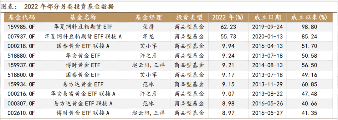 豆粕主题的另类基金在2022年的表现一枝独秀。豆粕期货类ETF涨幅超60%,而其他另类基金的收益率都在10%以下,表现靠前的主要是黄金主题。