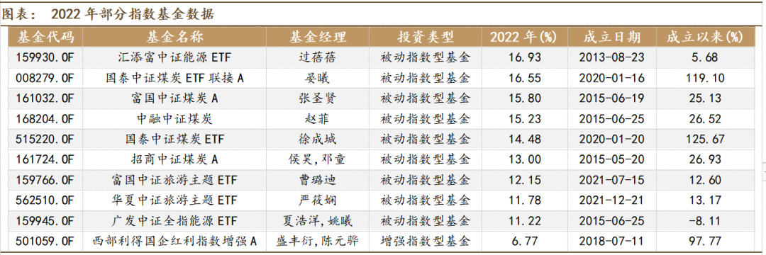 能源、煤炭、旅游主题的指数基金领跑2022年。根据统计,2022年表现较好的指数基金大多为被动指数型,追踪的基准指数中有5只为煤炭、2只能源、2只旅游,收益率均超过了11%,其中成立以来收益率最高的为国泰中证煤炭ETF,取得了125.67%的收益率。西部利得国企红利指数增强A是列表中唯一一只增强型的指数基金,收益率为6.77%。