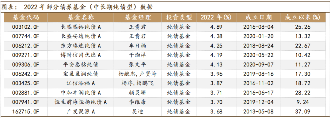 2022年表现较好的纯债基金多以信用挖掘策略为主,并且在11月的债市调整中最大回撤控制较好。其中,长盛、东方、博时、宝盈、中加等基金公司的产品采用了信用挖掘策略。此外,平安惠铭纯债、广发聚源两只偏利率债、金融债的基金也表现较好,基金经理在2022年的久期择时表现较为突出。