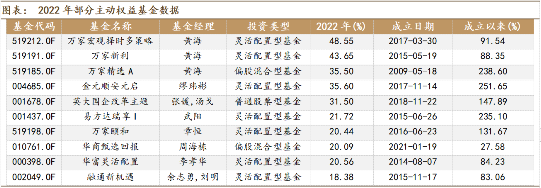 2022年表现较好的主动权益基金取得了40%以上的收益率,也有多只主动权益基金的收益率在30%和20%以上。根据分析,万家基金黄海在2022年始终保持较高的权益仓位,持仓行业主要集中在煤炭、地产和能源,所管理的三只产品都采取了类型的策略。其他与黄海采取类似策略或持仓的产品还有英大国企改革,其中报持仓主要以煤炭和能源为主,但在三季报时提升了消费行业的持仓。易方达瑞享的持仓相对均衡而分散,武阳配置了交运、有色、汽车、计算机、电力设备,但没有配置较热门的煤炭。