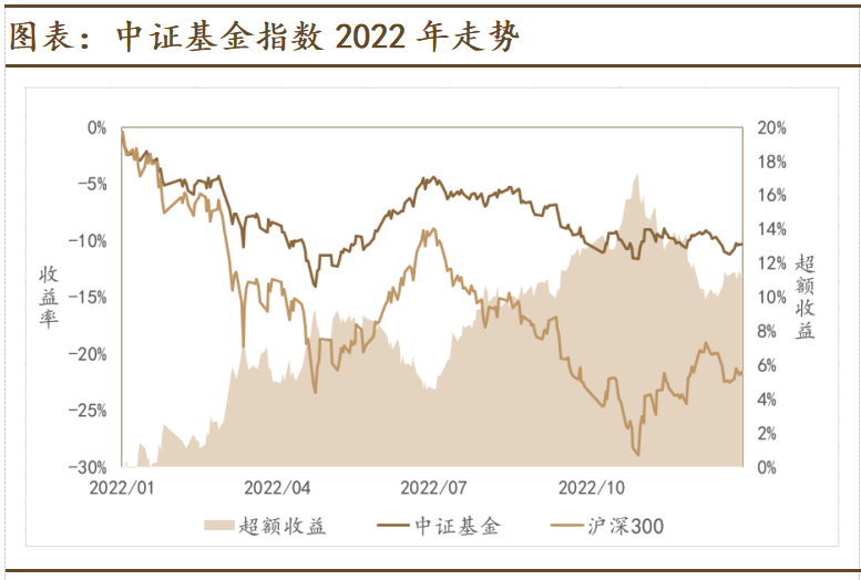 • 2022年中证基金指数下跌10.31%,自中证基金指数2003年发布以来的20年里,其2022年的表现在所有年份中表现位居第17,属于中等偏后,但较沪深300指数的超额收益仍有11.32%,在过去20年同期里排名第7。