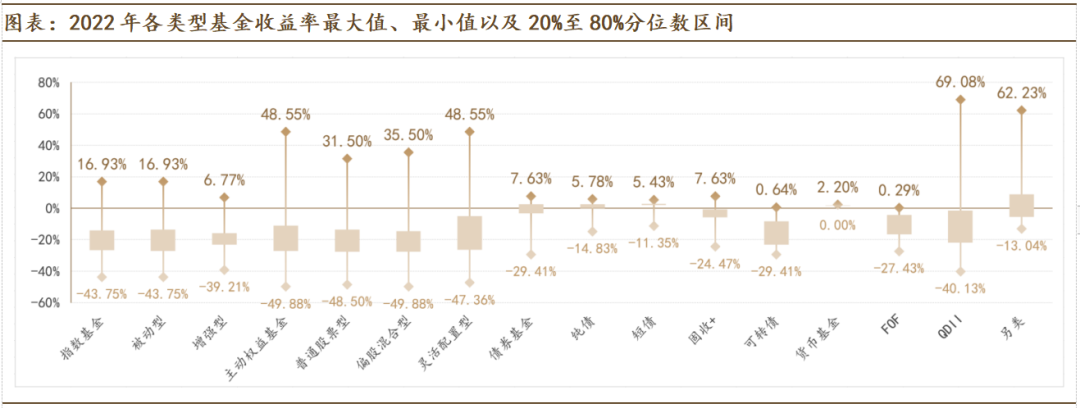 • 从一级分类来看,债券基金(1.77%)、货币基金(1.75%)、另类基金(1.84%)的中位数在2022年取得正收益。指数基金、主动权益基金表现较差,中位数跌幅接近20%。