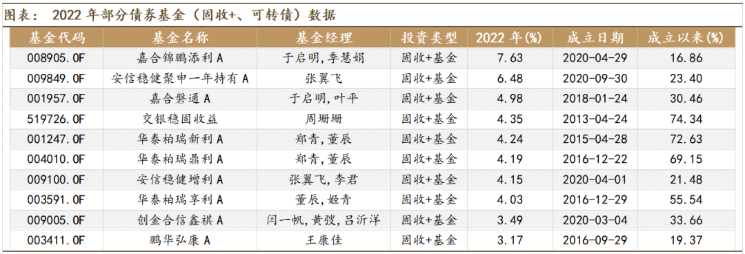 2022年固收+基金风格差异较大,其超额收益来源各不相同。从业绩角度来看,部分基金收益率超过3%,其中嘉合锦鹏添利A、安信稳健聚申一年持有A的收益率超6%。从投资风格上来看,有三只华泰柏瑞的产品上榜,整体风格相近,在转型后改为稳健的固收+策略,其持有体验、选股能力均较好。安信基金张翼飞的两只产品,其权益中枢差异较大,但持股风格接近,较好把握住了煤炭、地产等行业的机会。鹏华弘康是一只灵活配置型基金,但2022年未配置权益资产,因此表现较为平稳。