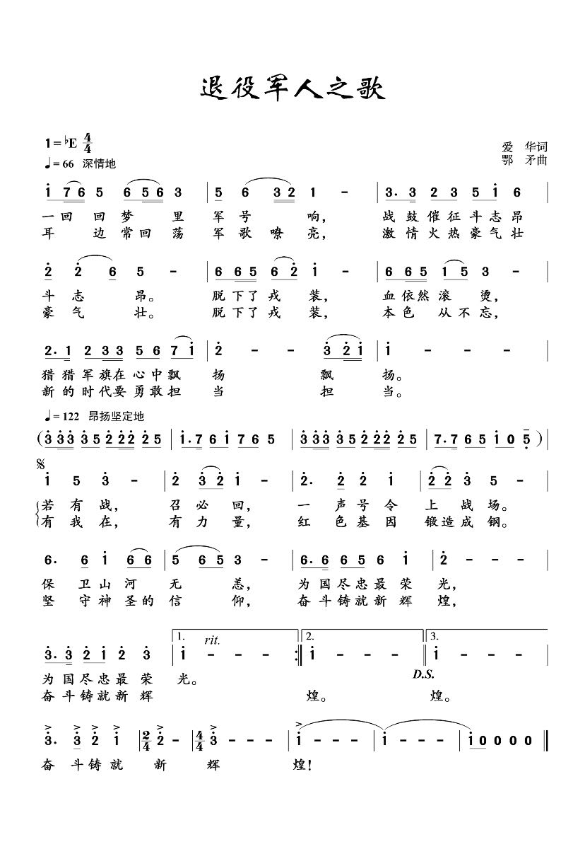 “一回回梦里军号响……脱下了戎装,血依然滚烫……一声号令上战场”唱出了广大退役军人若有战召必回的铮铮誓言,“猎猎军旗在心中飘扬……红色基因锻造成钢……为国尽忠最荣光”唱出了广大退役军人忠党爱军报国的拳拳之心,“激情火热豪气壮……有我在,有力量……奋斗铸就新辉煌”唱出了广大退役军人奋进新征程、建功新时代的蓬勃朝气,由著名词作者爱华、曲作者鄂矛、军旅歌唱家阎维文联袂创作的《退役军人之歌》反映了广大退役军人的精神品质,展现了新时代退役军人的豪情志气,敬请各地在“老兵永远跟党走——老兵宣讲”实践活动中宣传推广、广为传唱。