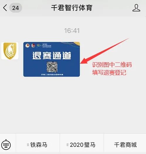 进入微信公众号“千君智行体育”→底部菜单选择“2020璧马”→选择“退赛通道”→识别二维码即可登记。