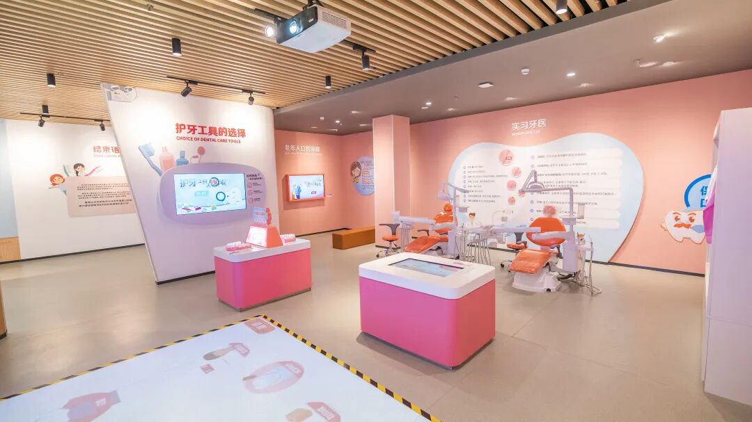 全馆以口腔和牙齿的形象提炼设计元素,围绕“生命全周期”的主线展示,设置“认识口腔、口腔探秘”两大主题展区,分“认识口腔、乳牙保健、口腔维护、口腔修复”四大板块内容。