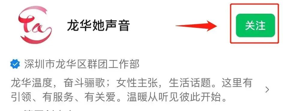 ▲第一步:点击下方名片进入“龙华她声音”公众号,并点击关注 ↓