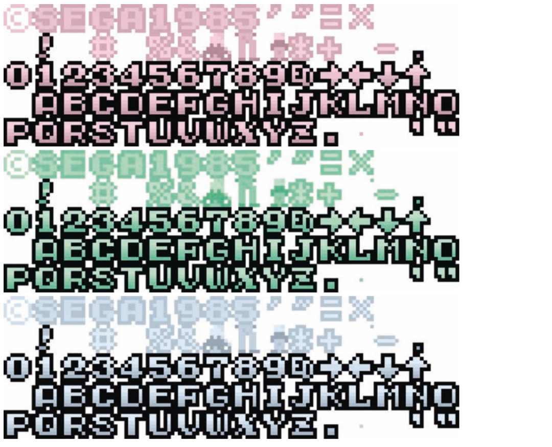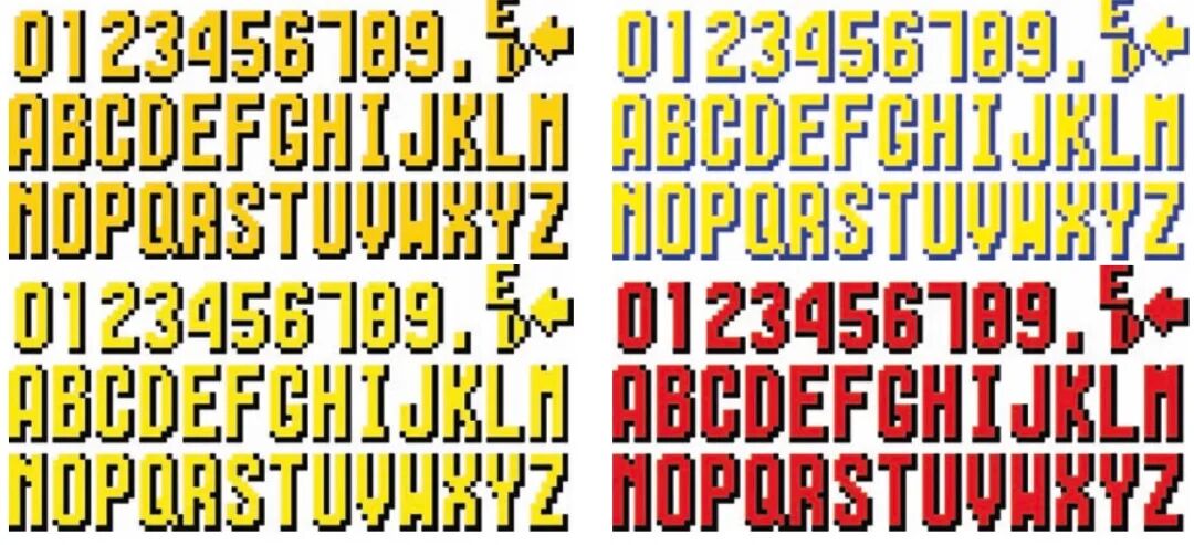 大部分游戏字体都会用尽 8×8 像素网格,把最外圈像素用作描边或投影,这样自然地形成了间距,也帮助字体在繁杂的背景中突出显示。在 80 年代早期彩色字体设计成为主流时,这种做法成为了非常流行的装饰样式。