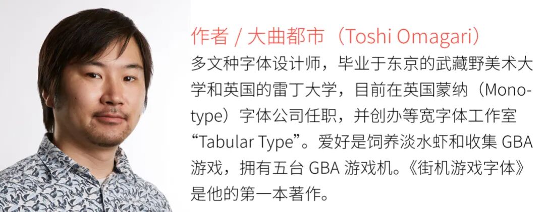 大曲都市(Toshi Omagari)是现工作于英国蒙纳字体公司的日籍字体设计师。他近年编著了《街机游戏字体》(Arcade Game Typography)一书,该书介绍了丰富多彩的游戏像素字体,涵盖了 70 年代至 00 年代大约三十年跨度的街机游戏历史和 240 款游戏中的字体设计。其中既包括《吃豆人》(Pac-Man)、《快乐射击手》(Hacha Mecha Fighter)等热门大作,也列举了一些冷门但优秀的设计,以及相对失败的作品。