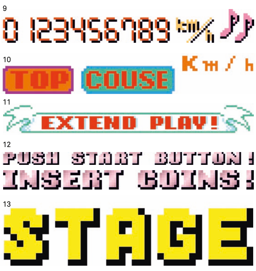 8×16 的字体被用在排行榜和姓名键入处,显示为黄色/黑色、柠檬黄/蓝色、柠檬黄/黑色和红色/黑色色板。速度计使用了另一套 8×16 的数字字体。此外,还有游戏标题字和其他杂项图像素材,例如「INSERT COINS!」,它由特制的美术字组成,而没有制作成其他字符。