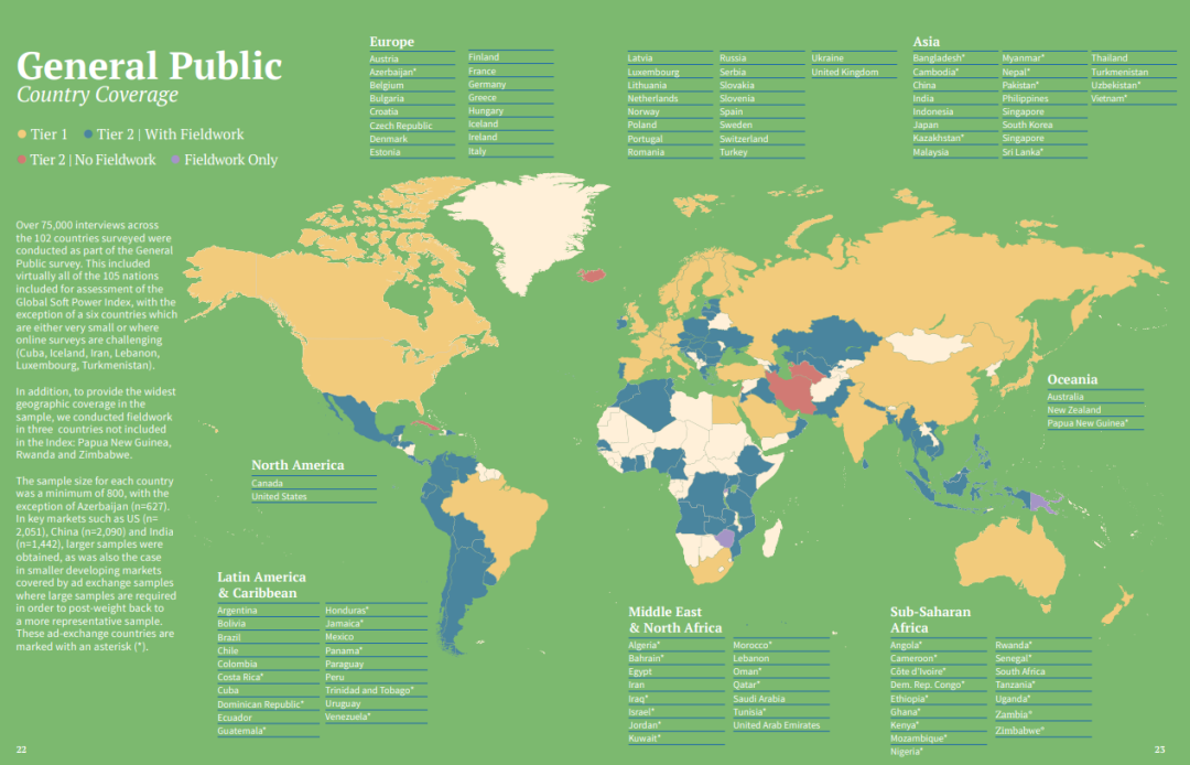 在2021年度的软实力指标排名中,德国位居榜首,加拿大位列第四名,排名在前20的国家分别是:德国、日本、英国、加拿大、瑞士、美国、法国、中国、瑞典、澳大利亚、韩国、荷兰、俄罗斯、挪威、丹麦、新西兰、阿拉伯、芬兰、意大利以及新加坡。Brand Finance也将上述20个国家称之为软实力最强的第一梯队(下图黄色部分代表 Tier 1)。今年全的球软实力排名五大参考因素分别是:国际知名度、国际影响力、国际声誉度、七大软实力核心指标以及在疫情中的应对表现。七大软实力指标则包含了:商贸评分、政府治理、国际关系、文化遗产、媒体传播、教育科学以及人文价值。加拿大在单项评分中的表现也十分抢眼: