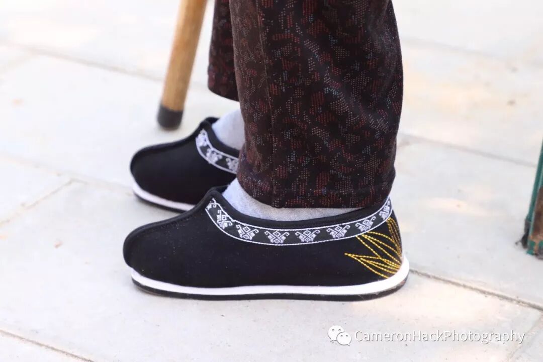 我们以前是农民,工作很辛苦。尽管我裹脚了,我还是要干活,每天干完活我的脚又会很疼。我生活很艰苦,我孩子年轻的时候,几乎没有什么东西吃,我努力干活养活他们,但是还是入不敷出,我要从别人那里借东西给他们吃。不管我多饿,我多想吃,我永远让我孩子们先吃。我让他们要吃多少吃多少,如果有剩余的,我就会吃点,不然我就饿着。尽管我现在老了,但是我觉得我很健康。我早睡早起,每天早上5点钟就起床了。我然后穿上鞋子,拿着我的拐杖,在院子里走走。我也还能做饭,但是我现在和我孩子们住一起,所以他们照顾我。我有孙子和曾孙,听到他们出生的消息是我一辈子最幸福的时刻之一。每天我女儿都用热水帮我仔细洗脚,我需要新鞋的时候,她就帮我从网上订。每双鞋子都是定制的,大概需要300块。逢年过节对我很重要,我们一家人会团聚,一起吃饭喝酒,看到一大家子和五代同堂,很温馨。几年前,我去天安门玩了一次还拍照了,完成了我其中一个梦想,至此我的梦想全都实现了。我儿子开车带我们去的,还给我拍照了。一直以来很多记者过来看望我、报道我,我觉得很烦人。他们只是过来给我拍几张照片,从来不和我聊天,但是从来没有外国人采访过我。现在我过的很开心