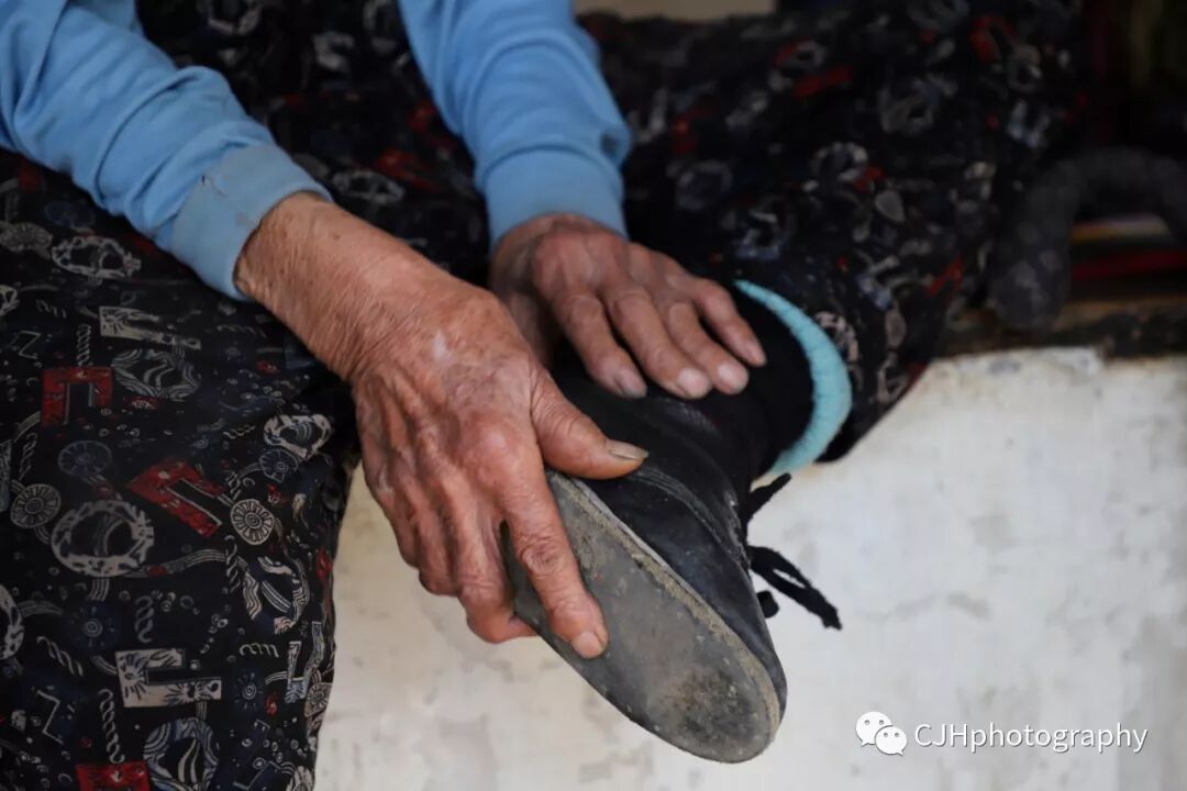 我最后悔的事情就是把她送人,我现在说起这件事还是很难过,会流泪。在我大概11岁左右的时候,我的养母开始给我裹脚,到现在我还是会用自己织的长布裹脚。我以前认识很多裹脚的妇女,但是她们基本都去世了,我觉得我可能是这里唯一一个裹脚老太太。我以前自己做鞋子穿,但是现在做不了了,我的手很疼,因为以前干了太多的活,也没有什么药能治。我女儿能帮我做鞋,但是她做的鞋子太大了。我从来不让别人看我的脚,因为我觉得它们很丑,是很私密的事情。我现在和我儿子儿媳妇一起住,他们照顾我。他们有时候工作忙,就早上把饭做好,我中午自己加热一下就能吃。我的背和腰都很疼。以前的生活很苦,我们每天都要扛很重的东西,久而久之身体就慢慢出现问题了。我今年85岁了但我从来没读过书,我们那个年代女孩子没有机会读书写字。我现在住的房子是我和我一起长大的男人以前住的房子,有很多回忆,但是都是很悲伤的,我没有很多快乐的记忆。我现在吃的很好,还有一些好看的衣服,我生日的时候整个家族的人都来看我,这些短暂的时光让我我感到幸福。