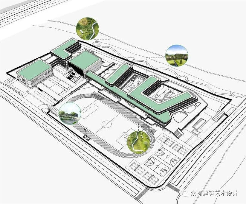 引入第四代建筑绿色、生态、环保和自然的设计理念,构建绿色生态系统。通过设置屋顶绿化和垂直绿化,营造出一个适宜学习的微气候,并让建筑立面富于生机和趣味。