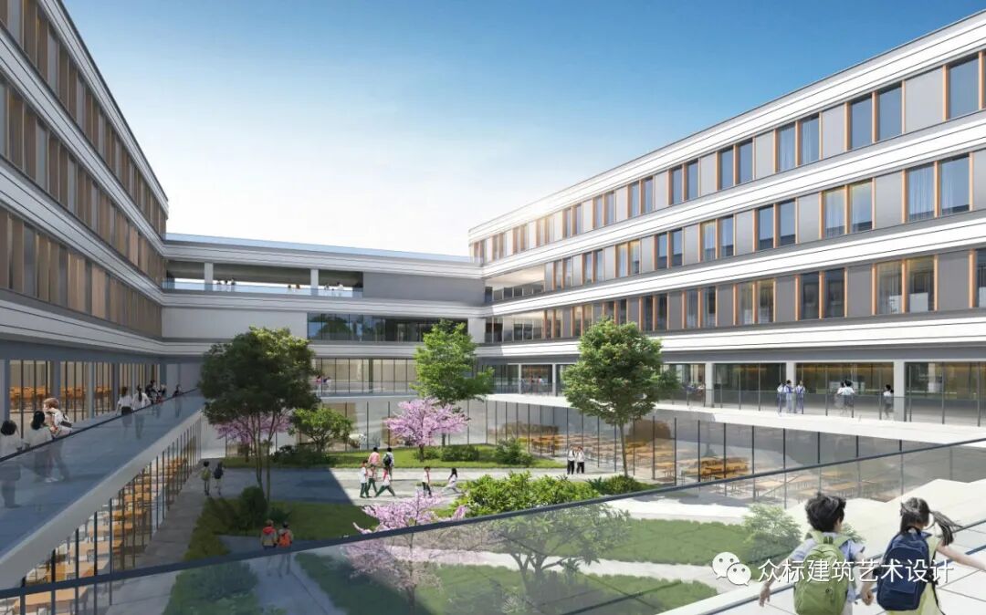 景观绿化布置充分考虑到校园与周边生态环境的特点,利用建筑“折型”形体布局围合成多个院落,立体学习连廊通过错落叠置,建立竖向空间层次感和流动感。