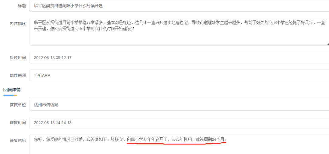 今年6月份,有居民在政务网咨询向阳小学相关信息,相关部门回复,向阳小学将在今年开工建设,工期24个月,2025年完工投用!
