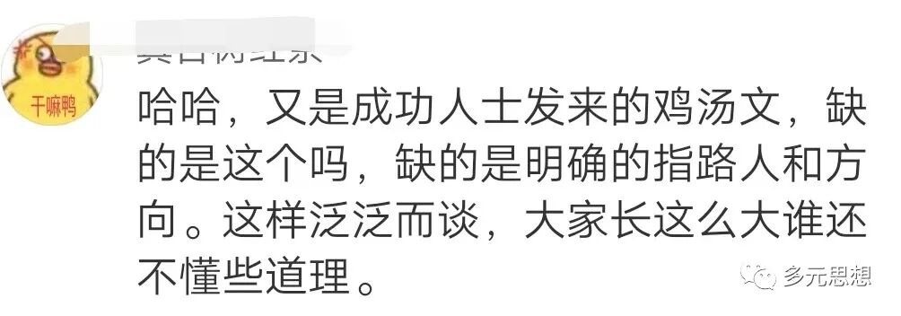 呜呼!多少年了,多少违反常识的,不合逻辑的,反智的甚至反人累的概念和价值观,就是像这样以“鸡汤”的形式,不经意地成了“前浪”们鹦鹉学舌的口头禅和嘲笑打击独立思想者的标准答案,无数的人脑因此致残。。。。。。人类文明走到二十一世纪的今天,先哲们早已总结出与这个“金句”完全相反的至理名言:“不朽的文明国度,来自于深刻而无畏的批判。。。。。。”让我们回首仰视一下这些如雷贯耳的名字:鲁迅、胡适、老舍;莎士比亚、拜伦、狄更斯;雨果、巴扎克尔、莫帕桑;海明威、马克. 吐温;泰戈尔;托尔斯泰。。。。。。生前无一不是习惯于对现实的嘲讽、否定与批判,也正是他们对现实社会的无情嘲讽,坚决的否定和无畏的批判,才引领着人类走出丛林的黑暗,才有了人类文明的今天!而那些为君王唱赞歌,不吝啬赞美的奴颜谄媚者,则化作了人类历史进程中一堆堆肮脏的垃圾,一道道可怜的青烟!一碗“鸡汤”,熬出这样反智的“金句”作为中心思想,目的何在?一丝冷气直逼清醒者的脊梁。。。。。。值得欣慰的是,我们在大量被感动的“不要不要”的“前浪"们的赞美声中,也看到了很多“后浪”们留言中可贵的思想,明确拒喝这碗有毒的“鸡汤”:
