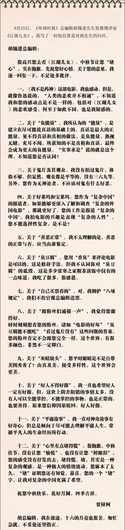 第二天,贾导发长微博回应,强调创作者要忠实于他观察到的社会和人性现实,不应该将作品纳入到任何被预先设计的思想或者情感框架中,并表示称“真话才是最大的正能量”。。。。。。