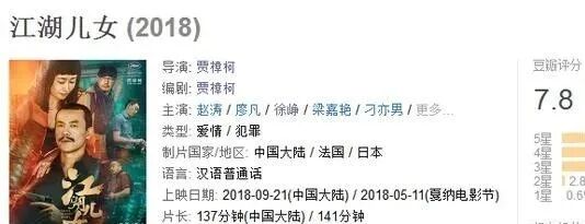 本号编辑导读:《江湖儿女》是由中国第六代著名导演贾樟柯执导的犯罪爱情电影,该片取材于真实的事件,由廖凡、赵涛领衔主演,徐峥、梁嘉艳、冯小刚、刁亦男、张一白等联合主演。该片于2018年初完成剪辑,4月入围第71届法国戛纳国际电影节主竞赛单元(获最高奖金棕榈奖的提名,是唯一一部入围主竞赛单元的华语影片。);5月11日,在戛纳电影节上举行全球首映礼 , 9月21日在中国大陆上映,在豆瓣上拿到了7.8分的高分(远高于同期所有热映电影)。属于那种“国外先香”“国内关心”的电影。。。。。。